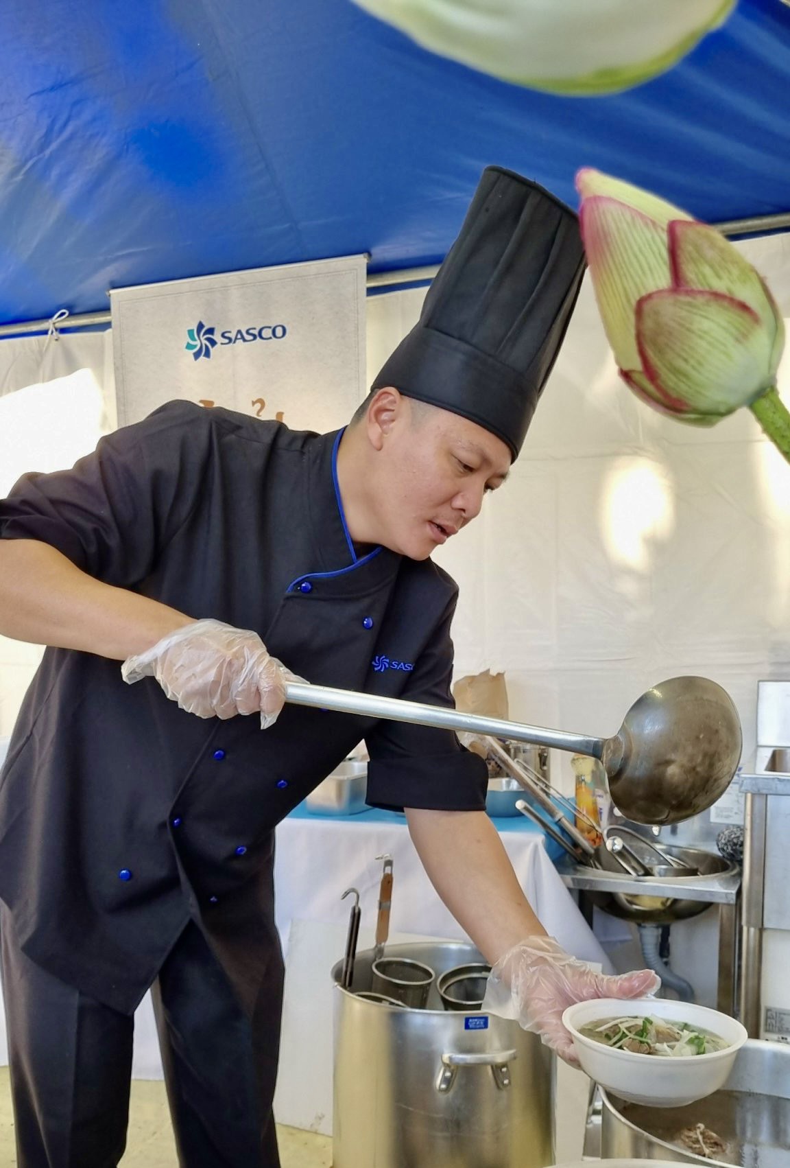 Bếp trưởng SASCO Phạm Quang Duy giới thiệu phở sen, phở matcha đến du khách lễ hội[/caption]