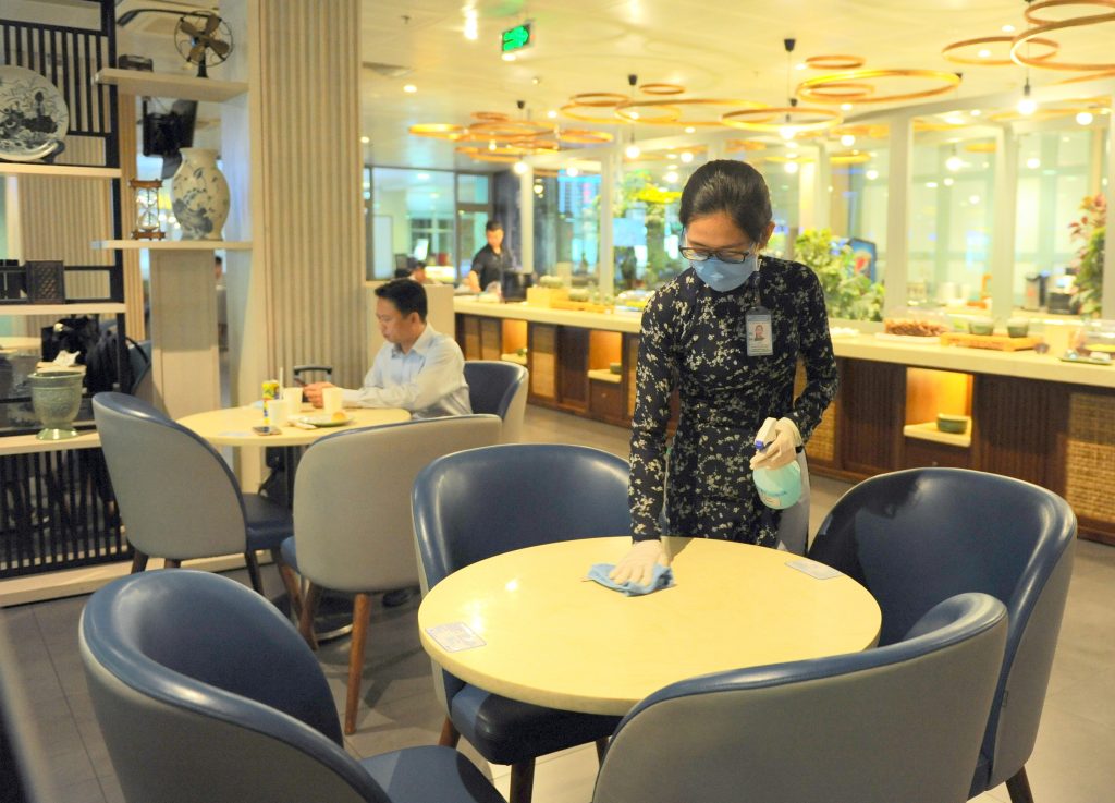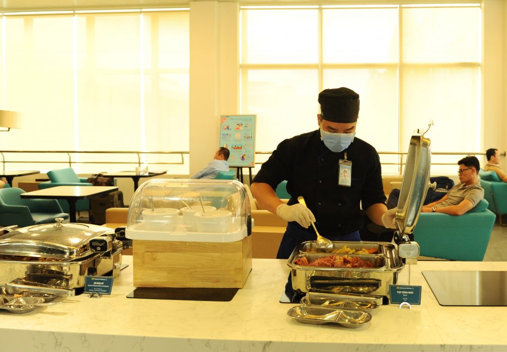 Hàng ngày, toàn bộ phòng chờ được phun khử khuẩn bằng dung dịch sử dụng trên tàu bay. Lau khử khuẩn mặt bàn, ghế sau mỗi lần khách sử dụng, lau khử khuẩn quầy ăn uống 2 giờ một lần