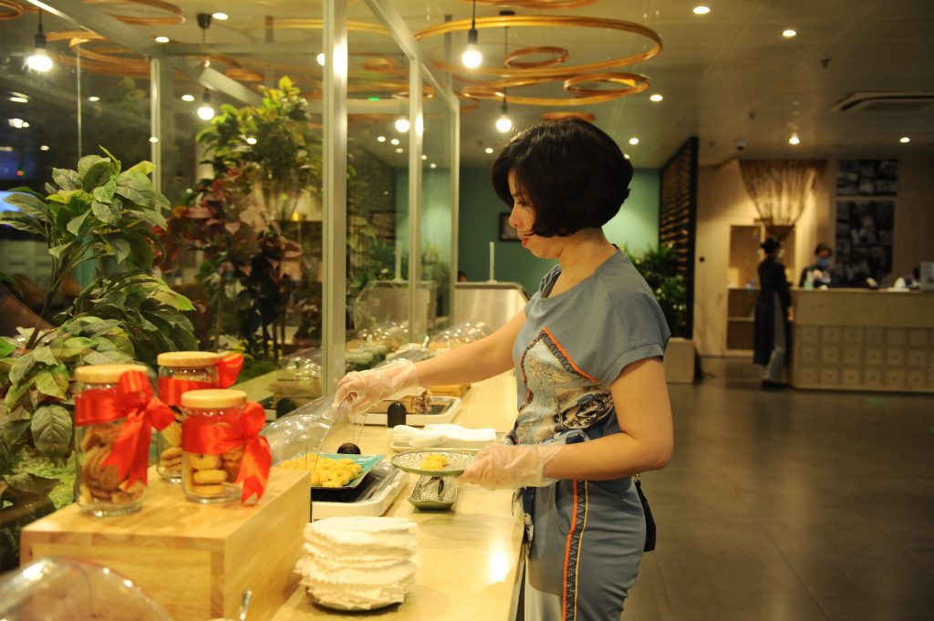 Quầy buffet tăng cường phục vụ các các món nóng, không phục vụ các món salad rau tươi, gỏi cuốn… Sử dụng nắp đậy cho tất cả các khay thực phẩm và khay đựng vật dụng ăn uống: dao, muỗng nĩa. Các vật dụng phục vụ ăn uống đều được đóng bao bì