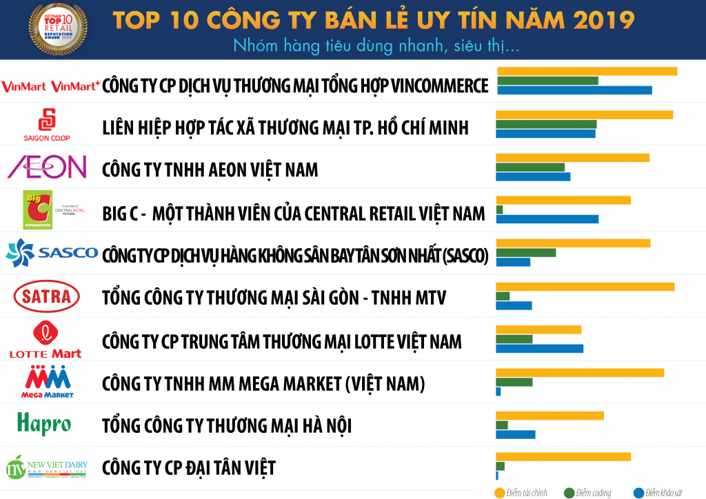 Top 10 Công ty uy tín ngành Bán lẻ là kết quả nghiên cứu độc lập được Viet nam Report thực hiện từ năm 2017. Dựa trên nguyên tắc khoa học và khách quan, các công ty được đánh giá, xếp hạng dựa trên 3 tiêu chí chính: Năng lực tài chính (tổng tài sản, tổng doanh thu, lợi nhuận, hiệu quả sử dụng vốn); Uy tín truyền thông; Khảo sát người tiêu dùng về mức độ nhận biết và sự hài lòng với các sản phẩm/ dịch vụ của công ty, khảo sát chuyên gia đánh giá vị thế của các công ty trong ngành và Khảo sát doanh nghiệp.