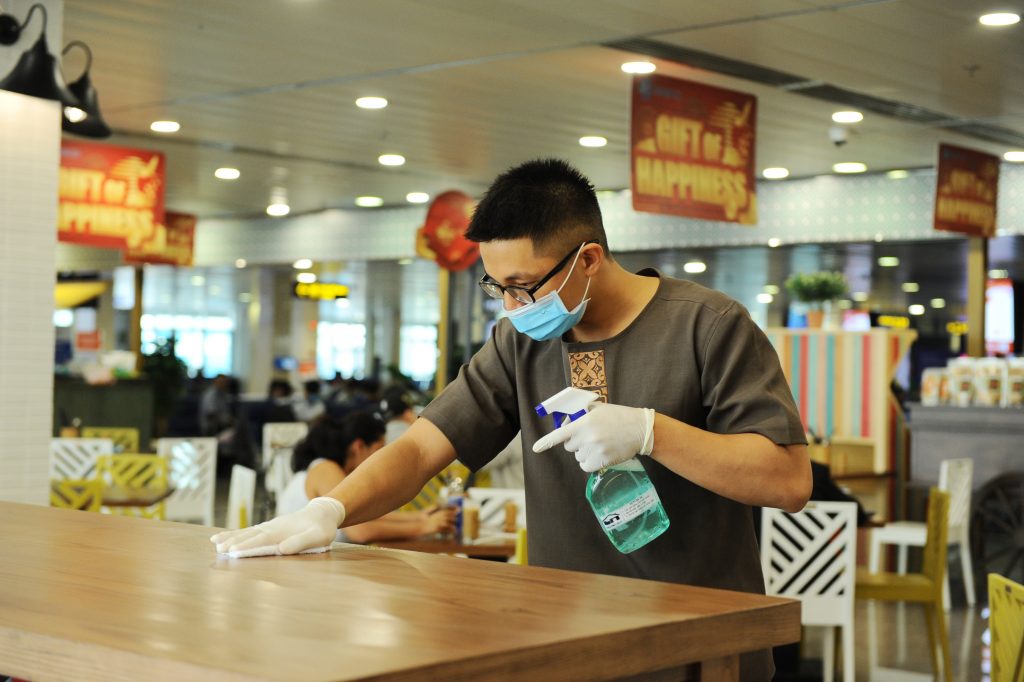 Nhân viên nhà hàng của SASCO vệ sinh bàn ghế với dung dịch sát khuẩn[/caption]