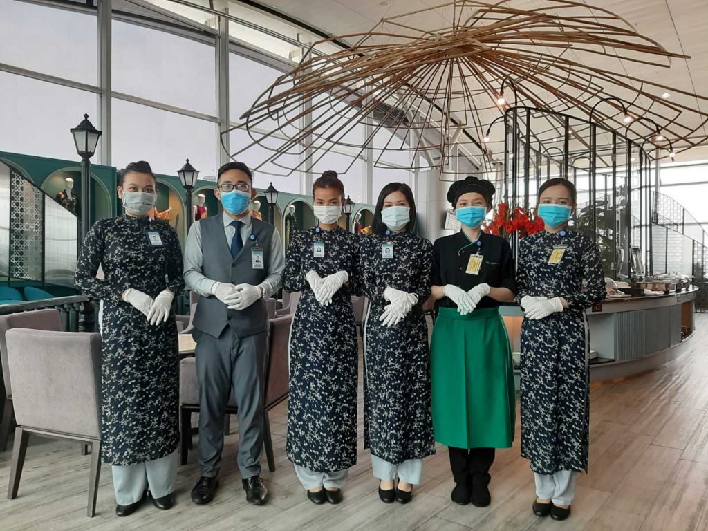 Nhân viên phòng chờ hạng thương gia SASCO Business Lounge tuân thủ nghiêm ngặt quy định về an toàn khi phục vụ khách hàng[/caption]