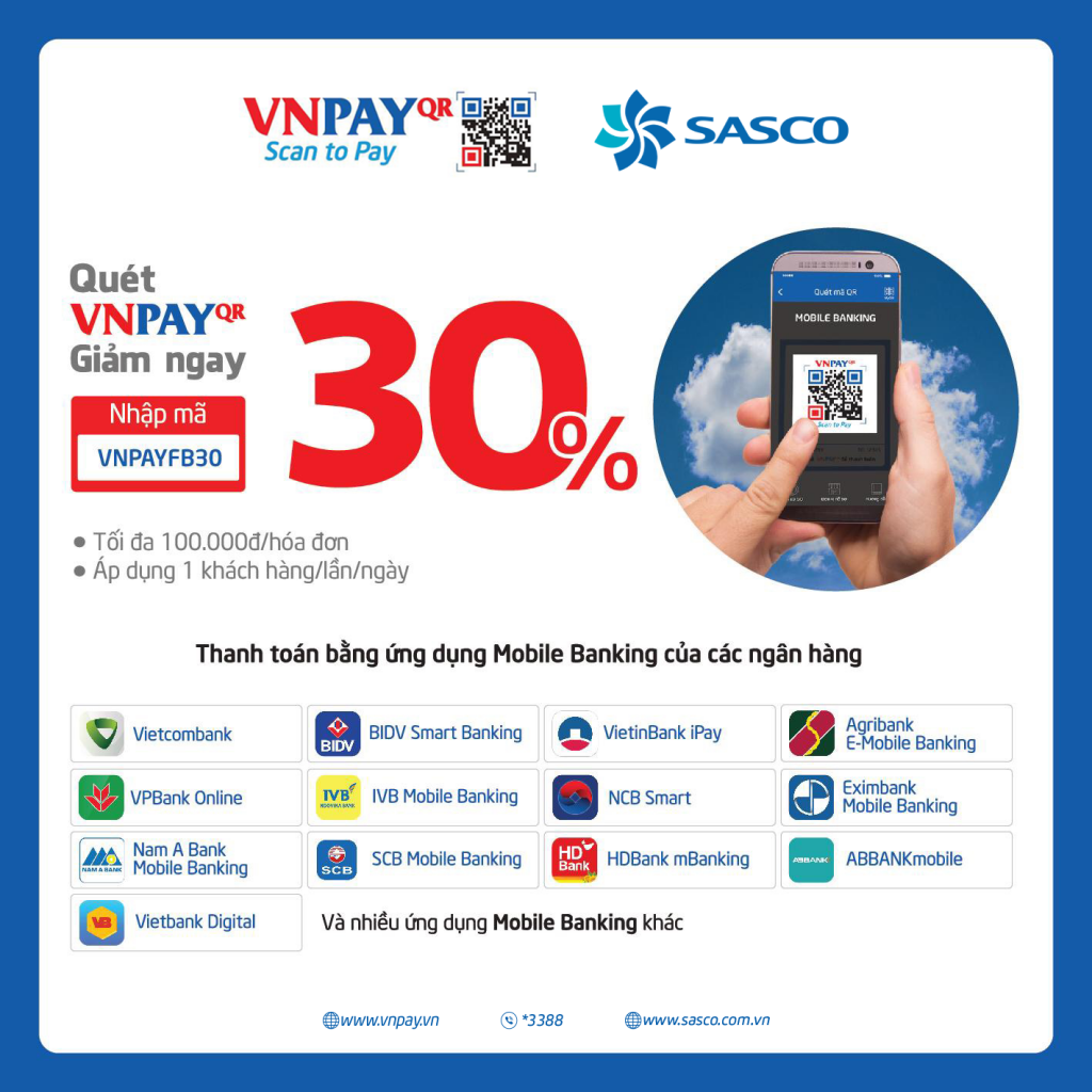 Từ ngày 01/10 - 30/11/2019, SASCO ưu đãi giảm 30% giá trị hóa đơn khi khách hàng thanh toán bằng VNPAY tại cửa hàng bán lẻ SASCO shop (quốc nội), nhà hàng The Phoenix, nhà hàng Cuisine de Saigon, cửa hàng tiện lợi Fresh2Go (quốc nội), +84 Cafe (quốc nội).