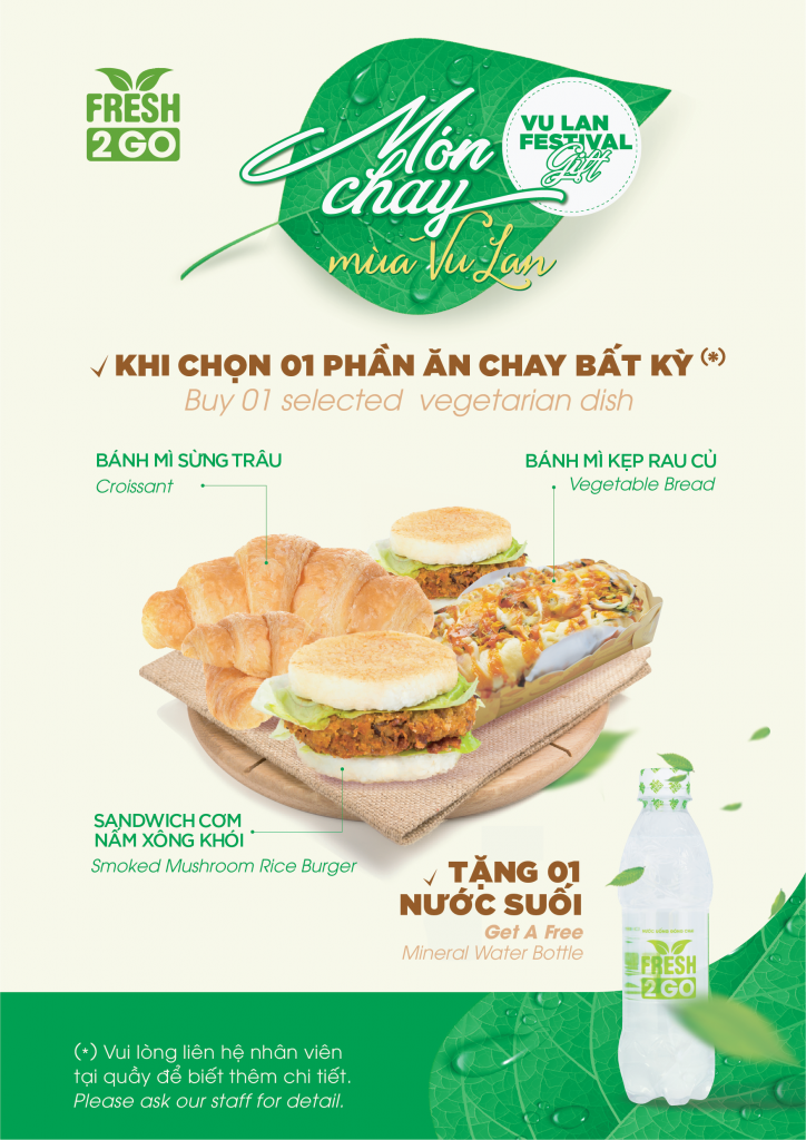 2.Tại cửa hàng tiện lợi Fresh2Go: Khách hàng sẽ được tặng những chai nước tinh khiết Fresh2Go khi sử dụng 1 trong những món chay sau: