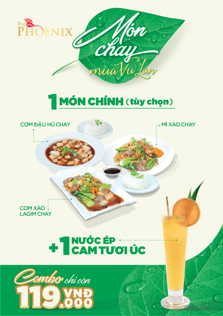 1.Tại nhà hàng The Phoenix: Combo 1 món chay và 1 ly nước ép cam tươi Úc với giá chỉ 119.000 đồng. Món chay bao gồm: